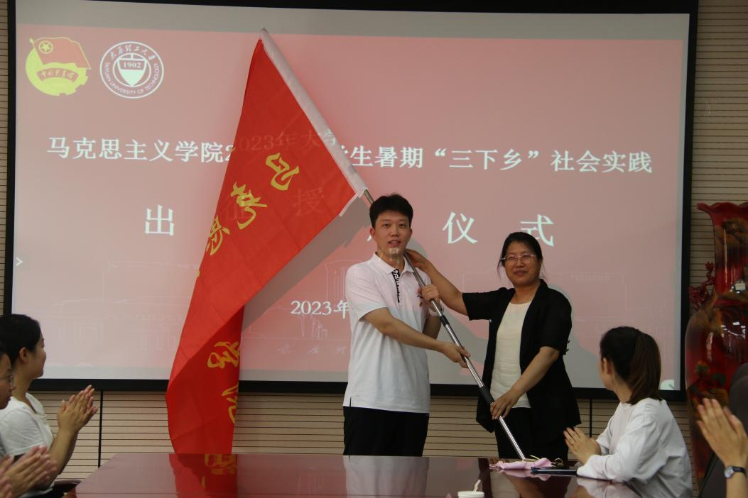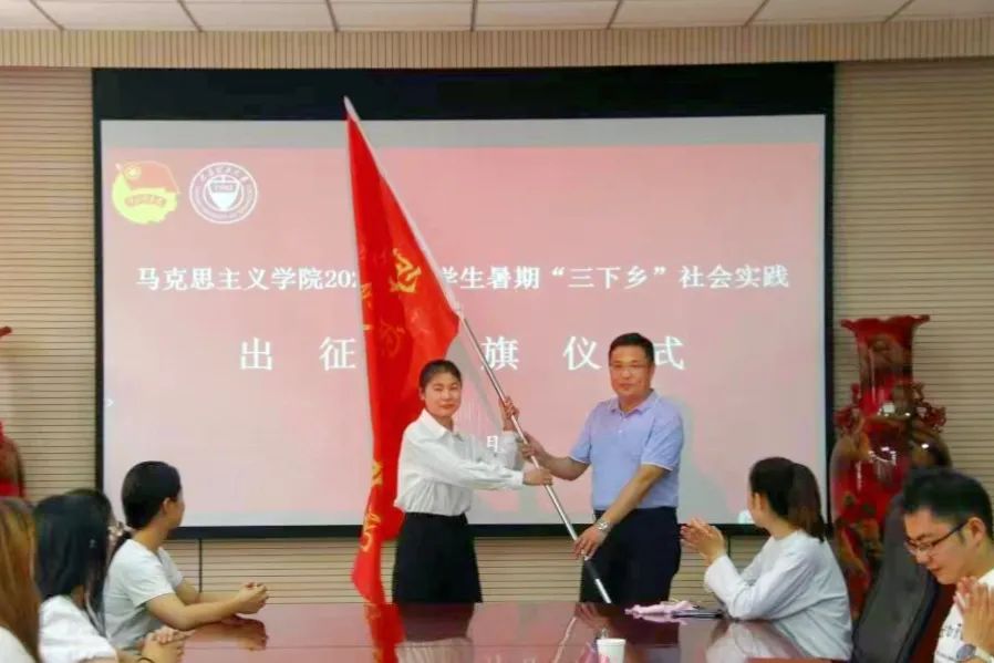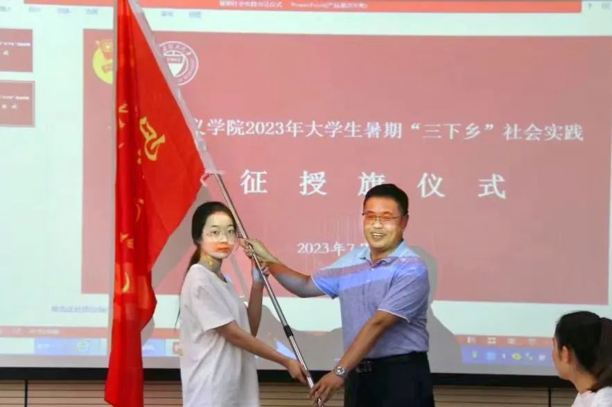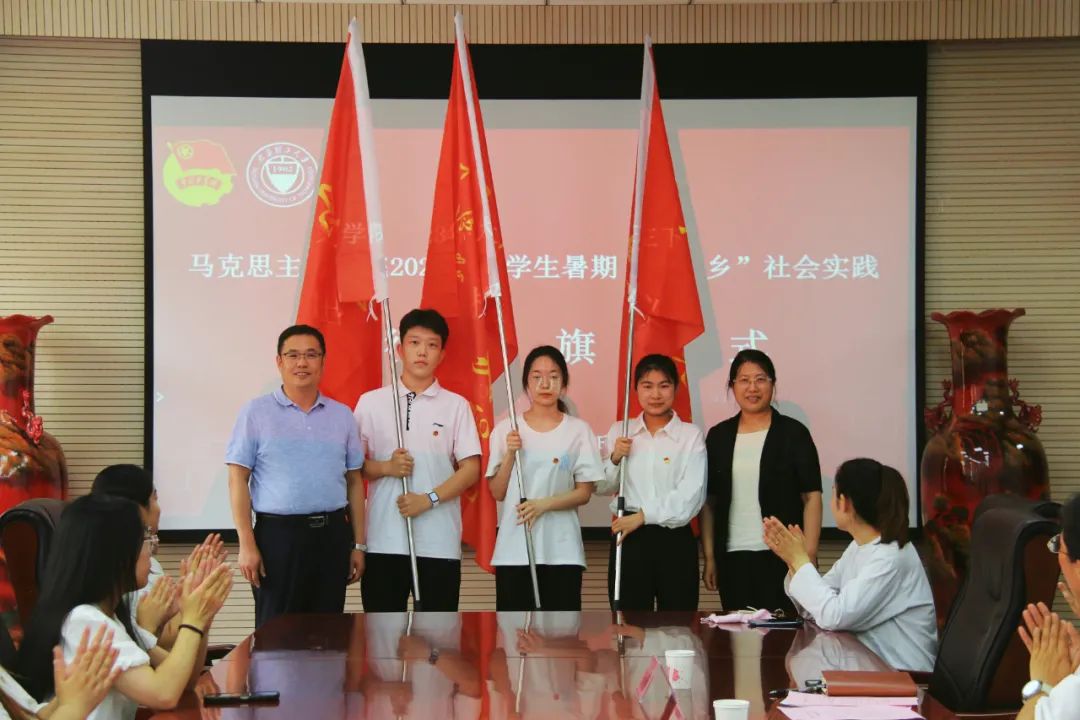 临行前,学院在三层会议室隆重举行出征仪式。院党委书记李济民、院长刘振霞作动员讲话,副书记甄炜主持会议,党政办主任苏琳强,辅导员闫卓恩、董航参加会议。李济民与刘振霞共同为三支队伍授旗,为同学们加油壮行。