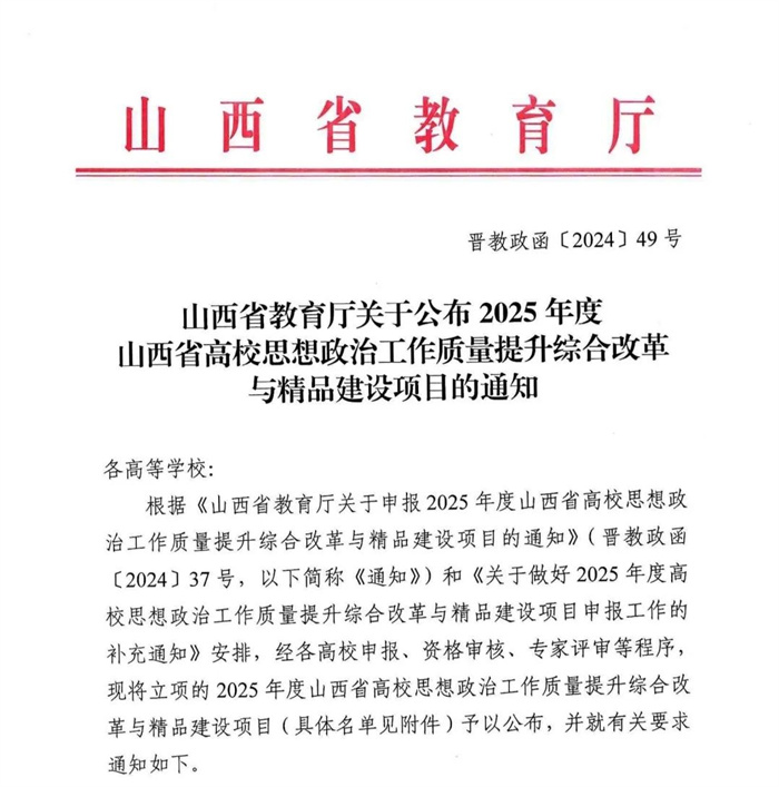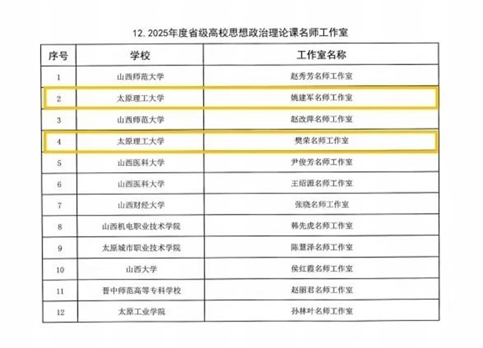 近日,省教育厅公布2025年度山西省高校思想政治工作质量提升综合改革与精品建设项目立项结果。经过学校推荐、材料审核、专家评审、结果公示等多个环节的角逐,新葡萄8883官网AMG姚建军名师工作室、樊荣名师工作室获批2025年度省级高校思想政治理论课名师工作室。