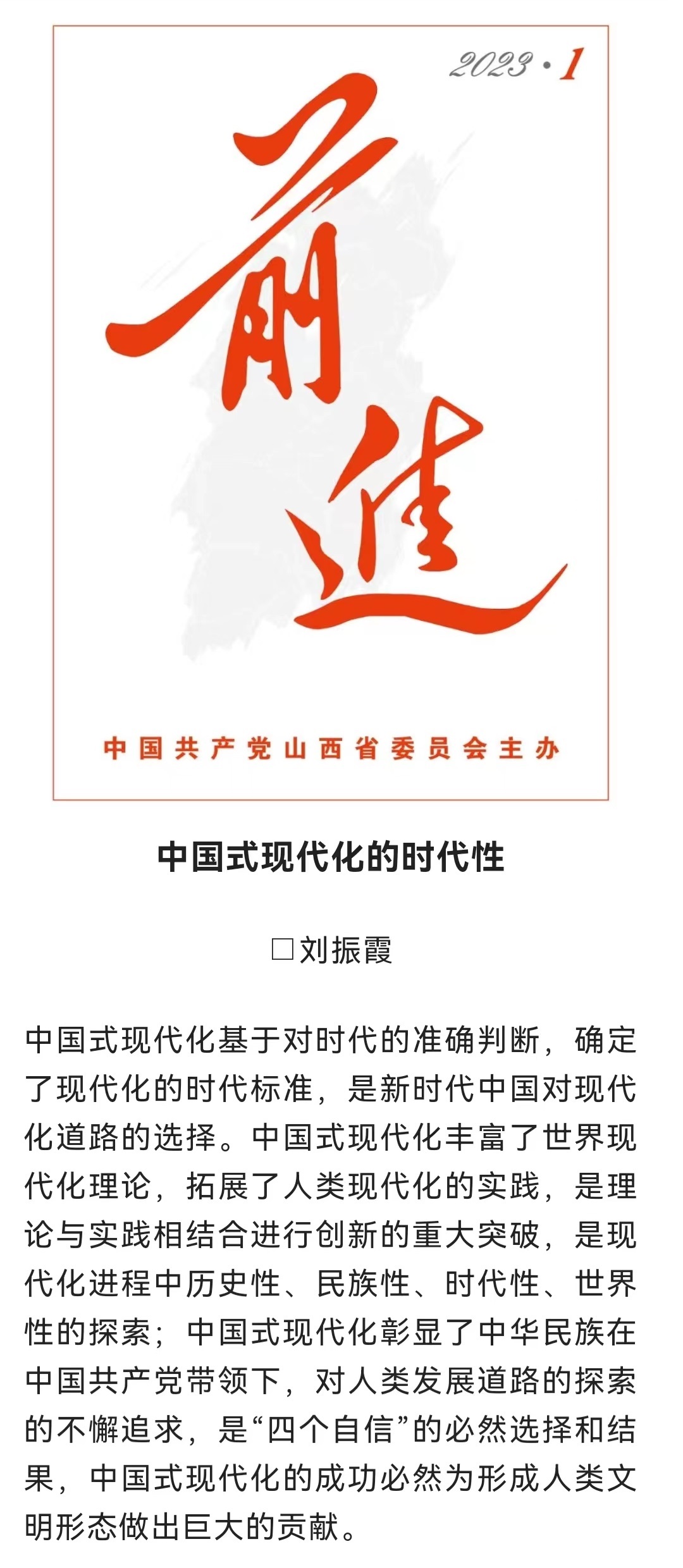 近日,《前进》2023年第1期刊发新葡萄院长刘振霞署名文章《中国式现代化的时代性》,《前进》微信公众号在“前进论坛”栏目中进行了全文推送。