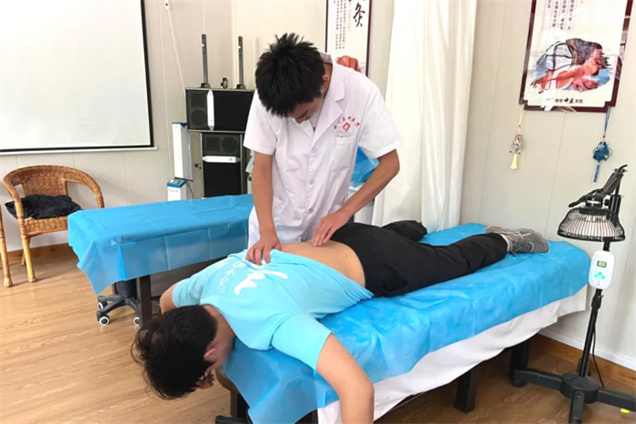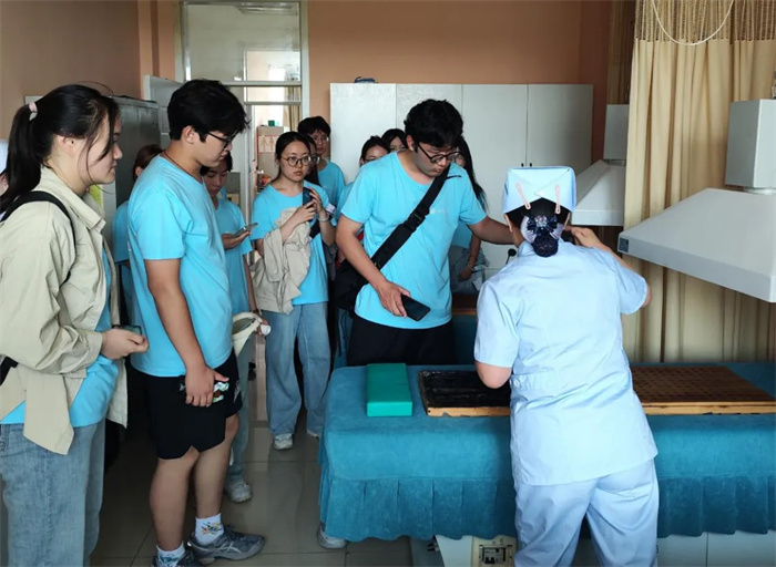 实践队员参观松庙村卫生室“怡养松吧”,体验推拿、艾灸等中医疗法。